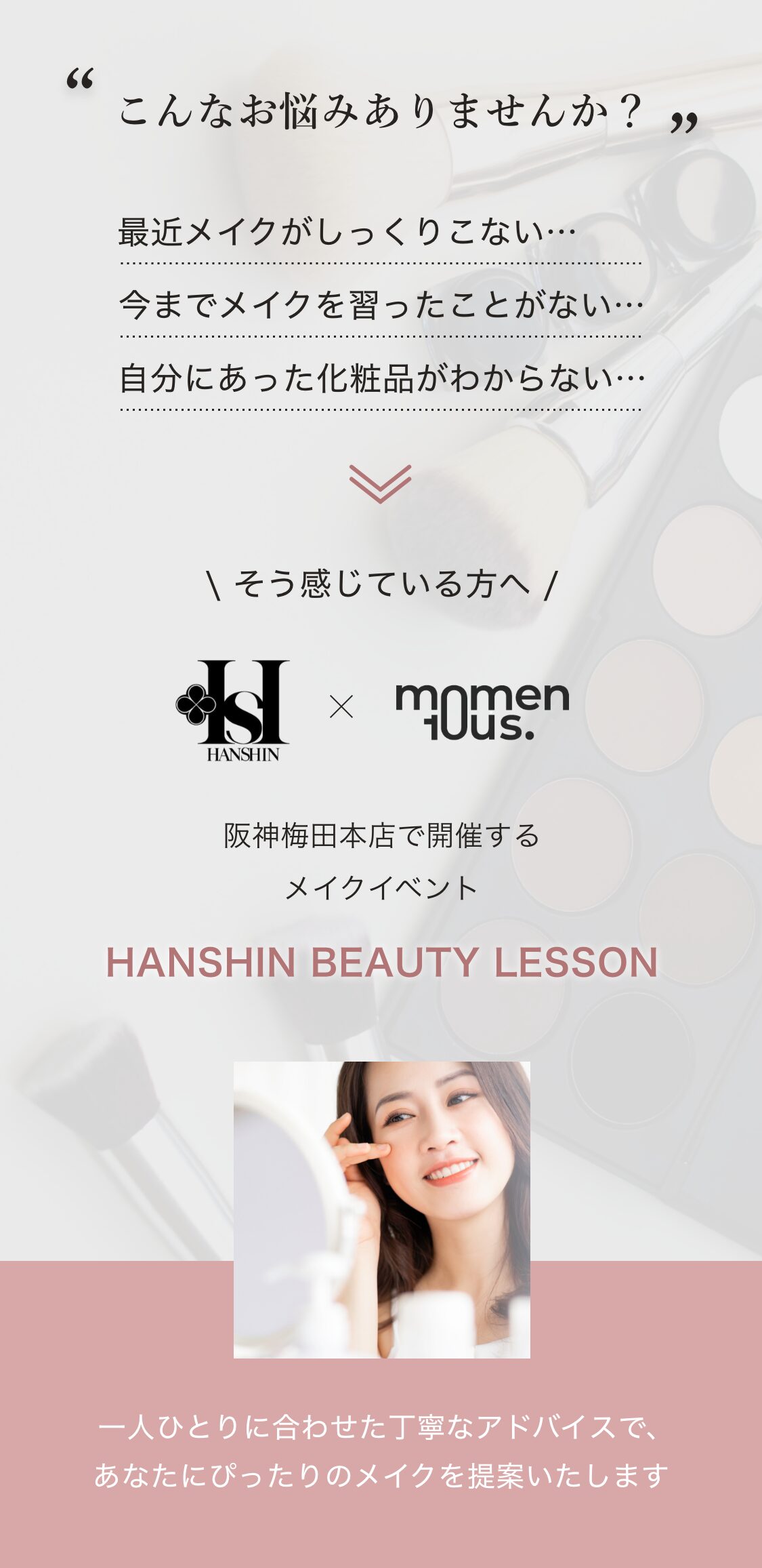 \ 累計10万件超の実績を持つプロがご提案/ HANSHIN BEAUTY LESSON 開催日 11/12(水)〜18(火) 12/24(水)〜28(日) イベント実施日の2~3週間前に予約開始いたします 現役のメイクアップアーティストが あなたの魅力を全力で魅き出します Ryo Ogawa メイクアップアーティストとして約20年の経歴をもち、現在も第一線で活躍中。国内外の雑誌撮影やショー、バックステージ、メイク学校講師やセミナーなど幅広い分野で活動。モデルの良さを活かし、ファッションやお顔立ちに合わせた似合わせメイクを得意とする。お客様からは丁寧で分かりやすく、なりたい自分に出会えると好評の大人気アーティスト。 Tomoko Ogawa 化粧品業界での経験を経て独立。専門学校や百貨店のブランドでビューティーアドバイザーのトレーナーやメイク講師として活動しています。美容業界での経験は28年に及びメイク心理学にも精通しています。私のレッスンでは、メイクを通じて皆さんの内面からの変化を引き出すことを大切にしています。自分を変える力を持つメイクを、ぜひ体験してみてください! その他3名のアーティストでお迎えいたします ※メイクアップアーティストのご指名は基本的にお受けしておりません メイクの現役プロによるレッスンで あなただけのメイク、体験してみませんか? Q. メイク初心者でも参加できますか? もちろんです!初心者〜上級様までお楽しみいただける、お客様のご希望に沿ったパーソナルなレッスンをご用意しています。ぜひ安心してご参加ください。 Q. 付き添い(同伴)はできますか? 会場の空きスペースにてお待ちいただくことが可能です。 Q. 子連れでの参加は可能ですか? お子様連れでのご参加は可能です。お子様のお世話やご様子にご配慮いただけますと幸いです。 Q. 当日の持ち物はありますか? 不要です。 Q. メイクをして行っても良いですか? クレンジングをしてからのレッスンになりますので、普段のメイクでお越しください。